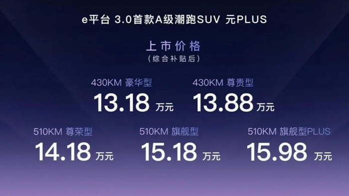 在元PLUS之前,比亚迪已经在e平台3.0上发布了首款车型海豚,其月销量已经达到了上万辆,市场表现已经得到了市场和消费者的认可。而作为该平台上的第二款产品,比亚迪元PLUS虽然续航里程只有430km和510km两个版本,但是在刀片电池以及快充的加持下,能够实现充电10分钟续航百公里。