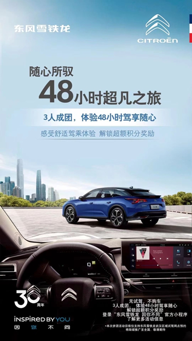 新车免费开,时间2天2夜,够不够凡尔赛?早在五一放假前,东风雪铁龙便正式启动了“为爱体验 全民凡尔赛——凡尔赛C5 X 48小时免费试用 武汉首发仪式”。4月30日起,“东风雪铁龙 因你不同”官方小程序上线“为爱体验 全民凡尔赛”三人拼团活动,武汉区域的客户可以选择自己“开团”,也可以选择“参团”,完成试驾留资,拼够3人立即成团。很多武汉区域的客户邀请朋友们线上参与“3人拼团 开启48小时免费深度试驾体验”。