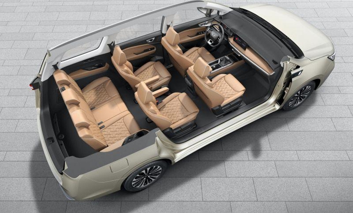 座椅采用“剧院阶 梯式“布局,前中后排每层落差 80mm,保证每排乘客获得同样优异的视野,享受舒适乘 坐空间。座椅呈 2+2+3 三排7座排列,主驾配备六向电动调节,高效便捷,避免驾驶疲劳,保证行车安全;中排座椅可前后移动120mm,椅背最大可调节至150度,用户则可以自由调节驾驶座椅,提高驾驶舒适性,有效防止因姿势不良导致的驾驶疲劳;第三排座椅坐垫以上高达952mm,带来阔绰头部空间,后排座椅可四六分放倒或向前翻折,实现后备箱最大容积1177L(四个20寸行李箱另加两个24寸行李箱),轻松应对多种装载需求,覆盖多场景用车需求,诠释家庭美好出行。
