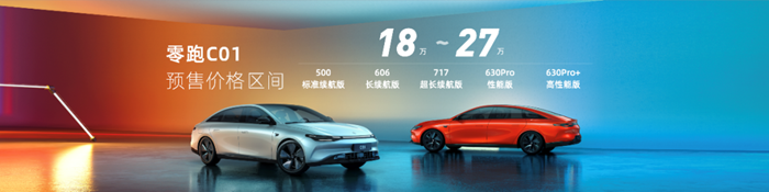 据悉,零跑C01是一款全智能多场景电动轿车,共发布500标准续航版、606长续航版、717超长续航版及630 Pro性能版、630 Pro+高性能版5个配置版本。同时,零跑汽车针对C01推出“0元预定”C位礼遇,预售期间下订,首任车主可享三电终身质保。