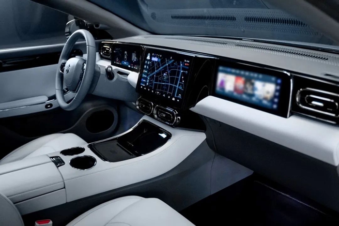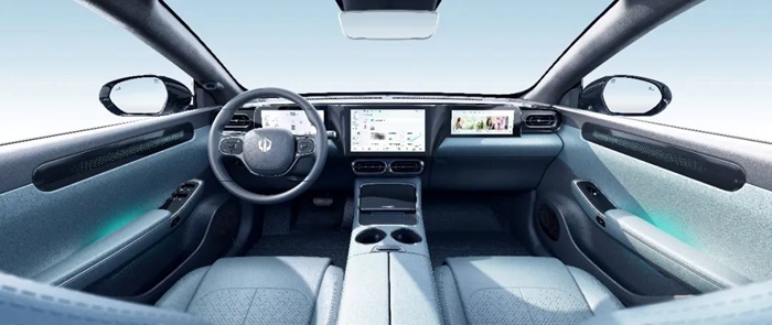 内饰方面,中控台区域沿用了零跑C11的T字型三联屏设计,不过内饰用料却更显高端,像全皮包裹的车门内板、NAPPA真皮方向盘、高档麂皮绒顶棚以及可选装的NAPPA真皮座椅,让手所触之处都更豪华。另外,得益于超长轴距,带来了319mm超大后排腿部空间和496L同级最大后备箱空间,让车内空间宽如自家客厅。
