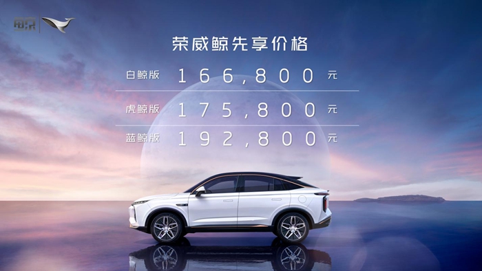 荣威鲸主打智能科技,共有白鲸版、虎鲸版、蓝鲸版三大车型,先享价分别为16.68万元、17.58万元、19.28万元;荣威龙猫针对职场独立女性,提供跃动龙龙版和灵动猫猫版两款车型,先享价分别为12.58万元和12.98万元。
