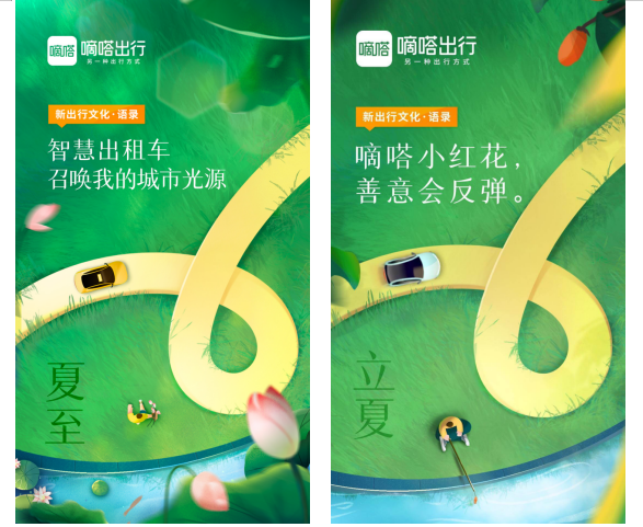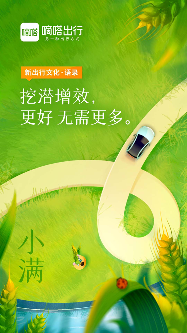 比如,在小满节气海报中,呈现的新出行文化语录是,“挖潜增效,更好无需更多”。这是在碳中和背景下,用户适宜秉持“恰到好处”的理念,践行以顺风车为代表的资源集约,让日常出行和生活都化繁为简。更好,无需更多,是小满节气蕴含的人生智慧,也给人们的出行和生活带来指引。