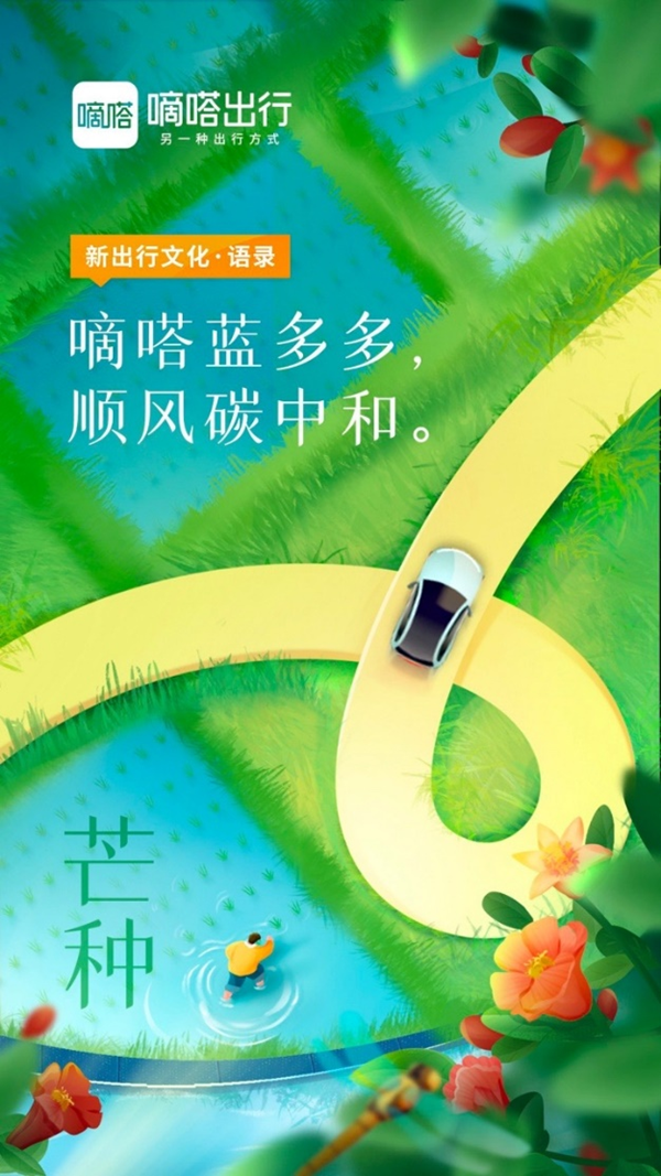 另比如“芒种”,是二十四节气中典型的物候类节气,提醒人们,在应该播种的时节,进行前瞻行动,才能等来丰收。就像嘀嗒出行的蓝多多计划,通过打造成为四轮零碳出行解决方案的方式,带领更多用户持续践行顺风低碳出行,从而让蓝天更多。