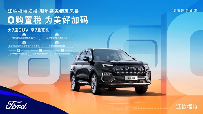 江铃福特科技敢于挑战旧格局,挑战老传统,既要为用户提供“先锋创新”的高品质产品,也要以全新服务体验为用户创造更多价值。为回馈广大用户的支持与厚爱,在江铃福特领裕上市一周年之际,江铃福特科技特别推出领裕“周年感恩钜惠风暴”。即日起至7月31日,领裕全系购车用户,均可享受“2大购车豪礼”“2大终身承诺”“3年用车无忧”七重豪礼,尊享“免费升舱”般超值体验。官方让利,价值升级,江铃福特科技再次夯实领裕大7座SUV性价比标杆地位,以十足诚意,陪伴用户携其所爱,共赴山海。