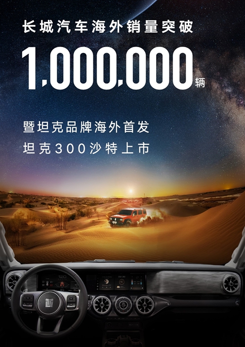在立足中国市场稳定发展的同时,长城汽车坚定地推动全球化发展,截至目前,长城汽车已出口到全球170多个国家和地区,海外销售渠道近700家。近日,随着坦克300在沙特上市,坦克500也在沙特亮相,长城汽车海外销量突破100万辆。站在新的起点上,长城汽车全球化进程迈入新阶段,将更多高端、智能化车型带给全球用户。
