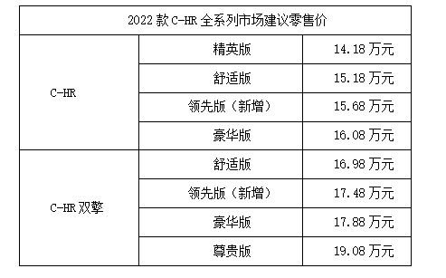 2022款C-HR全系列官方指导售价14.18-19.08万元。