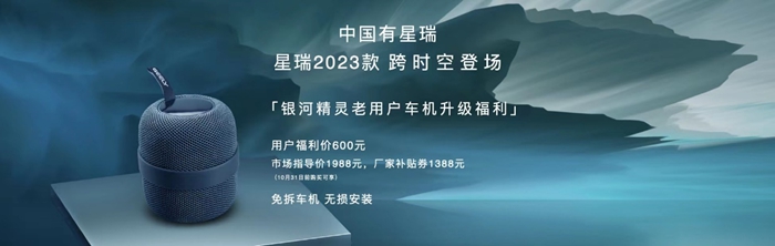 除上述礼遇以外,8月31日前订购星瑞2023款“只此青绿版”的用户,还可额外享受价值2000元【只此青绿】文创周边礼包;时空版还推出专属星辰礼包,选装价格为20000元。同时,为感谢星瑞20万用户的信赖与支持,吉利还推出“银河精灵”车机升级福利,可实现免拆车机、无损安装,即可享银河OS智能体验,市场指导价1988元;10月31日前,用户还可以在吉利汽车APP、吉利精品小程序、京东吉利汽车官方旗舰店领取1388元厂家补贴券,只需600元即可获得。