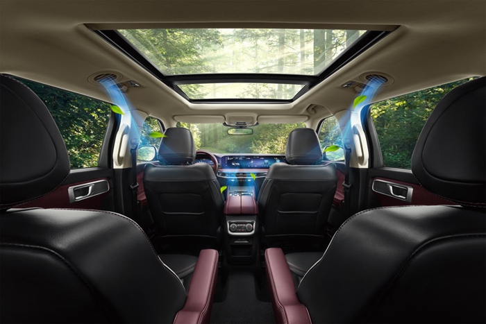 得益于超长的3025mm轴距,全新福特探险者拥有近6平米的“游艇”顶级座舱,带来阔绰的二、三排头部及腿部乘坐空间;面积超大的1.1㎡的全景天窗媲美阳光甲板;第二排可语音复位6向电动调节加大尺寸座椅,带来轻松惬意又具有仪式感的舒享乘坐体验。