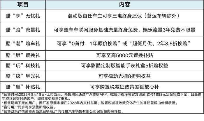 除此之外,广汽传祺还为当下年轻消费者带来了更多的用车附加价值,针对消费者的个性化、性价比等诉求,此次影酷的预售版本还具备12项硬核配置,入门即高配,并推出了7个选装包,与基础车型组合可提供多达2040种购车选择;同时,为了减缓消费者购车的经济压力以及用车的后顾之忧,首批预定影酷的用户,广汽传祺准备了酷“享”无忧礼、酷“跑”流量礼、酷“潮”购车礼、酷“燃”置换礼、酷“玩”科技礼、酷“炫”星光礼、酷“赢”补贴礼等7大特权,涵盖了从购车、质保、流量、金融、选配等方方面面,十分“超值”。而在预售期间下订的消费者,如因传祺原因未能在2022年内交付,同时国家购置税减征政策发生变化,广汽传祺将承担购置税差额,并且,已经盲订的消费者在已有盲订专属权益的基础上,可一并享受预售新增权益。