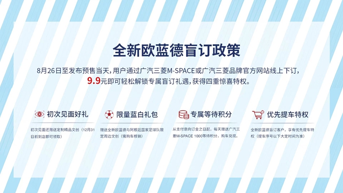 此外,为回应全国车迷的热切期待,广汽三菱还在车展上正式宣布开启全新欧蓝德限时盲订活动。8月26日起,仅需9.9元即可在广汽三菱APP或广汽三菱品牌官方网站参与盲订,轻松解锁四重惊喜好礼:初次见面礼,下订即送定制精品文创(12月31日前到店即可领取);限量蓝白礼包,可在完成购车核销后获赠全新欧蓝德与阿根廷国家足球队特别定制的限定周边文创;专属等待积分礼,从支付订金之日起,每天可获得1000分等待积分,在购车兑现后可凭积分换取超多精美文创礼品;还有优先提车特权,让你先人一步,上手新车。惊喜福利送不停,感兴趣的车友们千万不要错过。