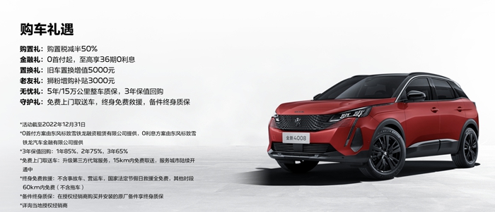 今天,小编就为大家推荐一款质价比很高的车型。目前,东风标致全新4008炫夜版车型在购置税减半的基础上,额外提供5000元置换补贴,以及3年保值回购+5年/15万公里质保等丰富福利与安心保障。特别要说明,全新4008炫夜版已经采用了官网直售模式,起售价17.07万元,线上订车,线下提车。对比市场上的日系和德系SUV,全新4008炫夜版在车价上,要便宜2-3万元,在价格方面,相当有惊喜。