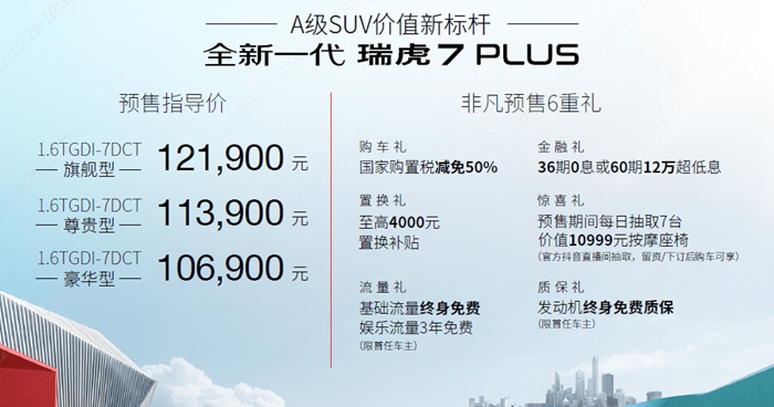 四川新闻网成都10月27日讯 2022年10月26日,奇瑞汽车旗下紧凑型SUV车型——全新一代瑞虎7 PLUS正式开启预售。新车共推出3款配置车型,预售价格区间为10.69万元-12.19万元。作为改款车型,新款瑞虎7 PLUS在外观、内饰及配置等多方面都进行了不同程度的升级,预计将于11月7日正式上市。