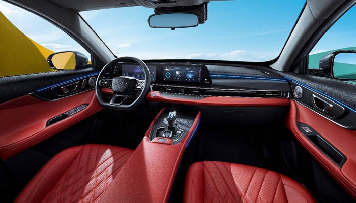 内饰方面,新车采用了木兰红+黑的撞色设计,配色十分亮眼,搭配中控台、车门饰板等处的镀铬装饰、64色音乐律动氛围灯,以及中央的水晶换挡把手,带来不错的质感。此外,车内还配备三辐式多功能方向盘、电子换挡机构,搭配24.6英寸的全液晶仪表盘与中控多媒体显示屏的曲面双连屏设计,内置LION5.0雄狮智云系统,支持车机互联、多媒体应用、车载KTV、AI互联远程车辆控制、AI自然语音交互以及OTA升级等多种功能,提升了车内的科技感。