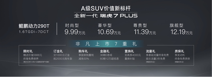 四川新闻网成都11月8日讯 11月7日,全新一代瑞虎7 PLUS正式上市,推出1.6TGDI-7DCT共4款车型,官方指导价9.99万元-12.19万元,此外还带来了非凡上市7重礼,包括订金礼、购车礼、金融礼、置换礼、流量礼、质保礼,为了表明对用户的心意,还特别带来了限时礼:12月31日前购车的用户将享受价值5888元的终身免费保养。新车以全球化车型的标准迭代升级,带来AI科技智慧座舱、晶彩先锋设计、最强鲲鹏动力及高标准五星安全设计,以“入门即高配,起步即升舱”的诚意,致力打造A级SUV价值新标杆。