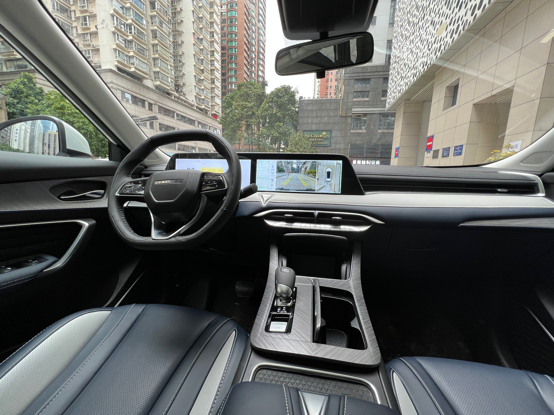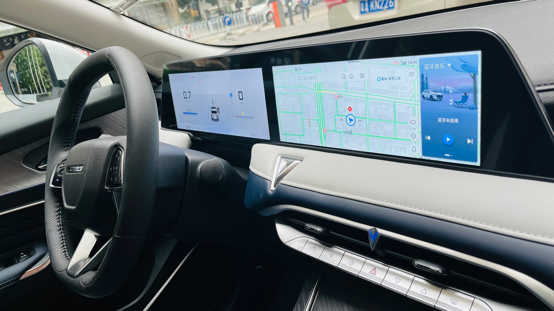 内饰方面,启辰大V以简约流畅为主,整体上比较有质感。中控台映入眼帘的是由液晶仪表盘与中控大屏组成一体式24英寸大联屏,内置了启辰V-Link星云智联系统,包含了语音交互、实时导航、在线娱乐、智能出行等功能。