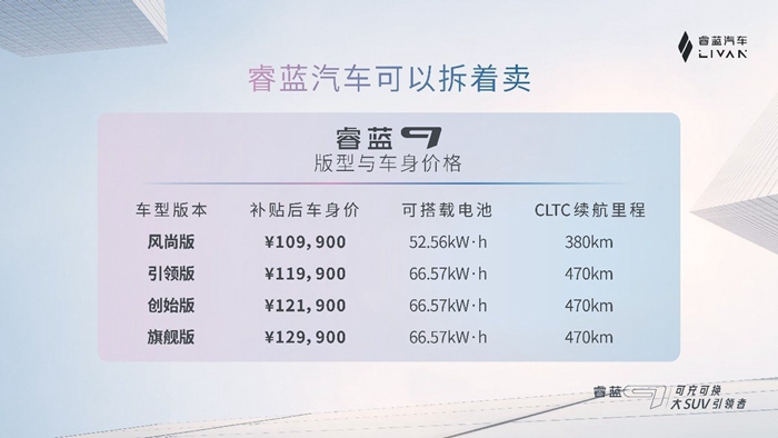 四川新闻网成都12月21日讯 12月17日,“换电轻出行普及者”睿蓝汽车旗下——睿蓝9正式上市。新车共推出风尚版、引领版、创始版、旗舰版4款配置车型,补贴后车身价格为10.99~12.99万元。同时,睿蓝9为用户提供整套动力电池解决方案,其中,包括电池订阅服务:66.57kWh电池包,月租金898元;电池金融服务:电池可以灵活分期,月供低至898元;电池买断方案:66.57kWh电池包买断价7万元,52.56kWh电池包买断价6万元。值得注意的是,此次上市发布价即国补补贴后价格,虽然国补退场,睿蓝9将把补贴进行到底!
