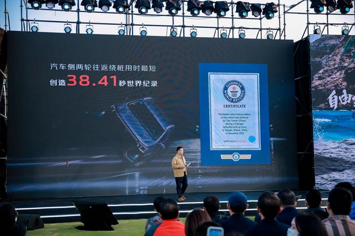 活动现场,长安汽车皮卡品牌事业部总经理陈维杰正式发布首个皮卡平台——“五岳平台”,定位于全球化皮卡基因孵化平台,未来它将孕育更多具备非凡全地形能力的系列皮卡产品。当天,长安览拓者现场开启了“吉尼斯世界纪录称号”挑战,以全程用时38.41秒的成绩,成功挑战“汽车侧两轮往返绕桩用时最短”,打破了德国车手驾驶豪华品牌所创下已保持六年的世界纪录,印证了其世界一流的底盘技术实力。