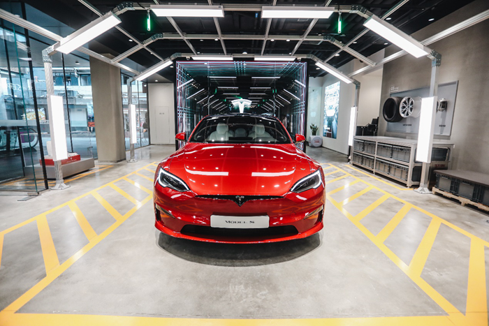门店设置了特斯拉零部件展示区域,包含车辆内部的15英寸触摸屏、完全自动驾驶电脑、360度摄像头等车辆零部件,以及车辆外部的轮胎、轮毂、卡钳等车辆配件,展示特斯拉总装车间如何“极佳”组装和出厂。总装车间,是智慧的车辆装配。在特斯拉超级工厂的总装车间内,高度人机协同、过程均有电脑系统介入,精确度可追溯至车辆每一颗螺丝的扭力。在总装完成后,特斯拉进行四轮定位、大灯、制动力和雨淋等检测,并在工厂内部专门的出场路试场地进行车辆试跑,保证每一辆车符合标准的送到消费者手中。