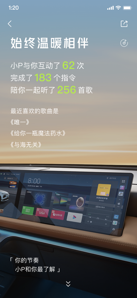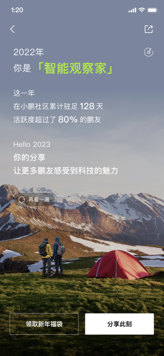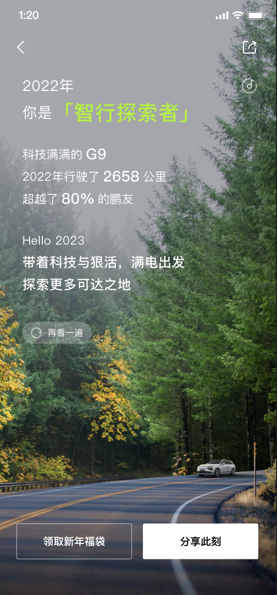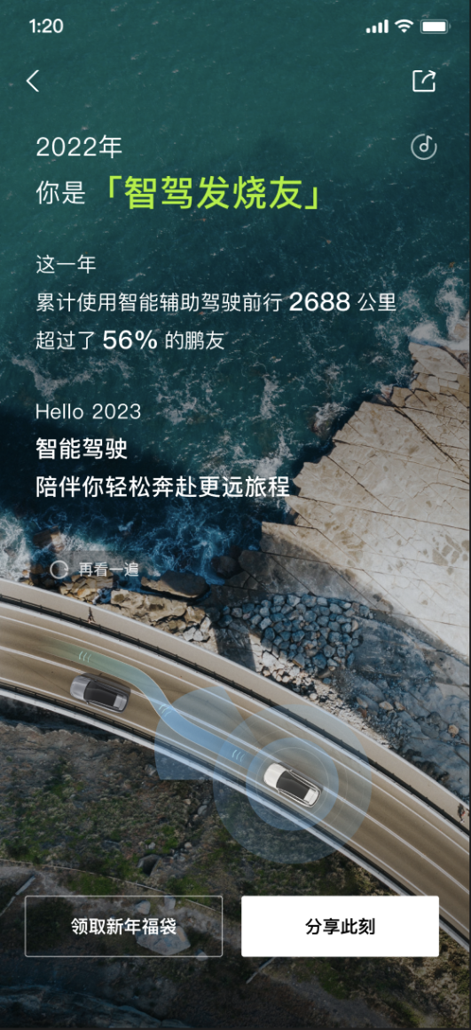 小鹏汽车APP社区将五湖四海的车主汇聚在一起,每每浏览,迎面而来更多的是归属感、共情感。踏入主页,点击进入小鹏年度用车报告,“HI 鹏友”将用户带回了2022年的点滴时光里。这一年,小鹏汽车智能导航开启总次数为227,562,658次,年度使用率高达99.65%;小P年度被唤醒总次数为236,385,059次,年度使用率达到99.88%;ACC总里程数更是出乎意料的达到153,342,644.7km;记忆泊车总路线数334,381次......这一连串的数字,由每一位鹏友共同参与汇聚!那在小鹏相伴出行的日子里,智能汽车都给你带来了哪些全新的体验?请回答你的2022......