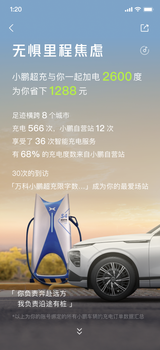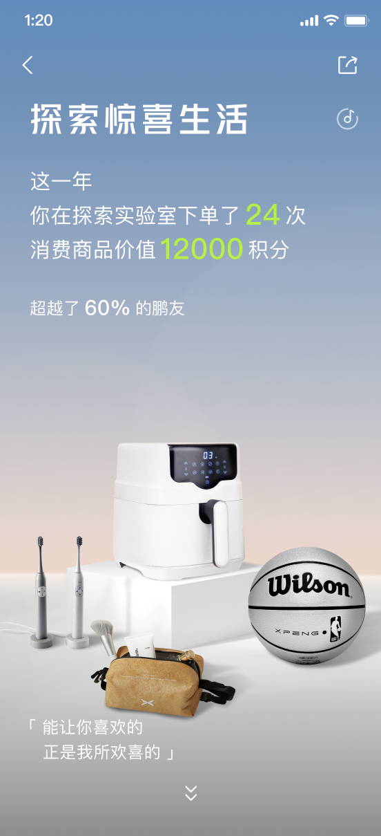 你的生活能量,小鹏超充站随时补给。你负责奔赴远方,我负责沿途有桩。小鹏全年的充电量达到了322,602,875.63kW.h,累计碳减排577,244,717.03kg。没想到一整年小鹏超充为你充了那么多度电,妥妥的经济学家!当然你也喜欢在探索实验室里消耗积分,选到喜欢的商品,不仅经济还能收获满心欢喜!