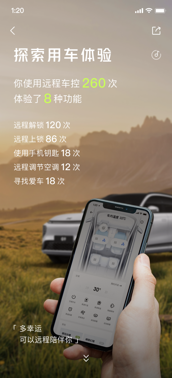 没想到你还是个探索小能手,积极发掘不同的用车体验,远程解锁上锁、远程调节空调、手机钥匙、寻车等功能在带来科技体验的同时在偶尔忘记带钥匙、不记得停车位等特殊情况时不忘及时传达人文关怀,这些都格外的重要。