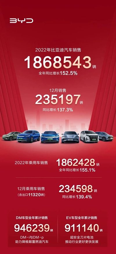 谈及新能源汽车的发展,绝对绕不开比亚迪汽车,其作为中国新能源汽车领域的中坚力量,以全年销量1868543辆,全年同比增长152.5%的好成绩,为2022年画上了一个完美的句号,也为2023年谱写出一个好的开端。