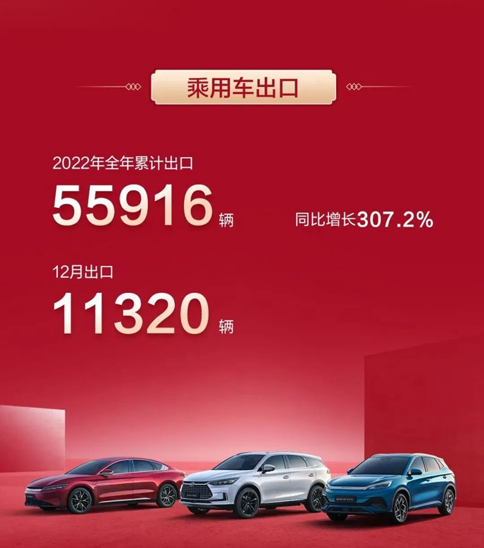 时至今日,比亚迪新能源汽车足迹遍布全球六大洲,70多个国家和地区,超过400个城市,整个2022年,比亚迪乘用车出口量达到了55916辆,同比增长307.2%,成为了真正享誉海外的“国货之光”。