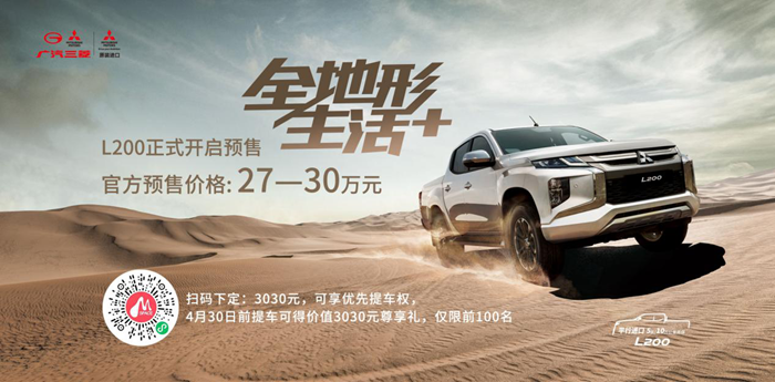除了全新欧蓝德,广汽三菱亦于近期推出了又一经典款新车——由广汽商贸平行进口,在广汽三菱渠道进行销售的高端皮卡L200,携动感造型、质享空间、超选驾控、科技安全四大核心优势,共推出探趣版 、探享版、探索版三款主力车型,并提供9大潮流色系。目前,L200已于广州车展正式上市并同步开启了新车预售,预售价格为27万-30万元,消费者只需3030元订金便可提前锁定这款三菱经典皮卡。
