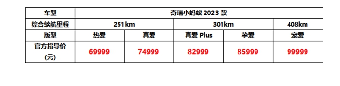 本次直播活动我们不仅揭秘了“顶流”奇瑞小蚂蚁成功背后的秘密,深切感受奇瑞新能源深厚先进的智造技术底蕴,还和万千网友一起见证了奇瑞小蚂蚁2023款上市高光时刻。新车包括251km、301km、408km三种续航五个版型,官方指导价69999元起。
