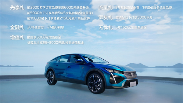 除了惊喜的预售价格以及超越期待的产品力,东风标致还推出多重无界预售礼遇。先享礼:前3000名下订,享免费至高6000元选装升级;前5000名下订,享免费5年5次基础保养(含首保);前10000名下订,享免费2166元原厂精品套件。金融礼:30%低首付,24期0利息。增值礼:换购享5000元增值基金,标致车主享额外3000元增/换购增值基金。流量礼:5年基础流量免费,1年增值服务流量免费。狮友礼:邀请好友下订获5000积分。无忧礼:5年15万公里整车质保。