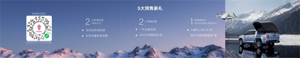 参与预售的用户还可以享受5大的预售豪礼,包括两大终身权益:大道皮卡的首任车主,发动机终身质保、车机流量终身免费;两大预售惊喜:一年金融免息、3000元增换购礼金;前三千名线上预定用户再享超级好礼:与大道皮卡互联的大疆无人机1台或价值5000元的联名车载帐篷套装1套。