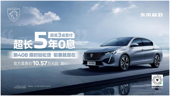 近日,东风标致针对新408这款揽奖无数的“家轿卷王”,推出“限时轻松贷”福利:2023年4月29日至5月22日,购买新408,即可享受超长5年0息,超低3成首付,助力消费者轻松拥有高品质出行生活。
