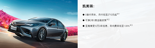 同时,为了减轻消费者购车负担,凯美瑞推出一系列购车优惠政策。5月1日-6月30日预订凯美瑞,可享受0首付用车、2年0息金融政策和至高10万3年低息*,轻松开启美好车生活。