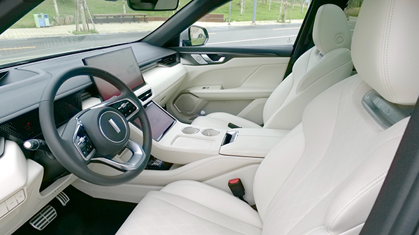 但是从外形和内饰造型来看,长城不仅没有故步自封,而是大胆创新,比如这细长的头灯、上半部分封闭下半部分无边界的进气格栅设计,内饰虽然不是大联屏,但是也是三屏,而且布局让驾驶者和乘客都能操作。配色和做工也是很有质感的。
