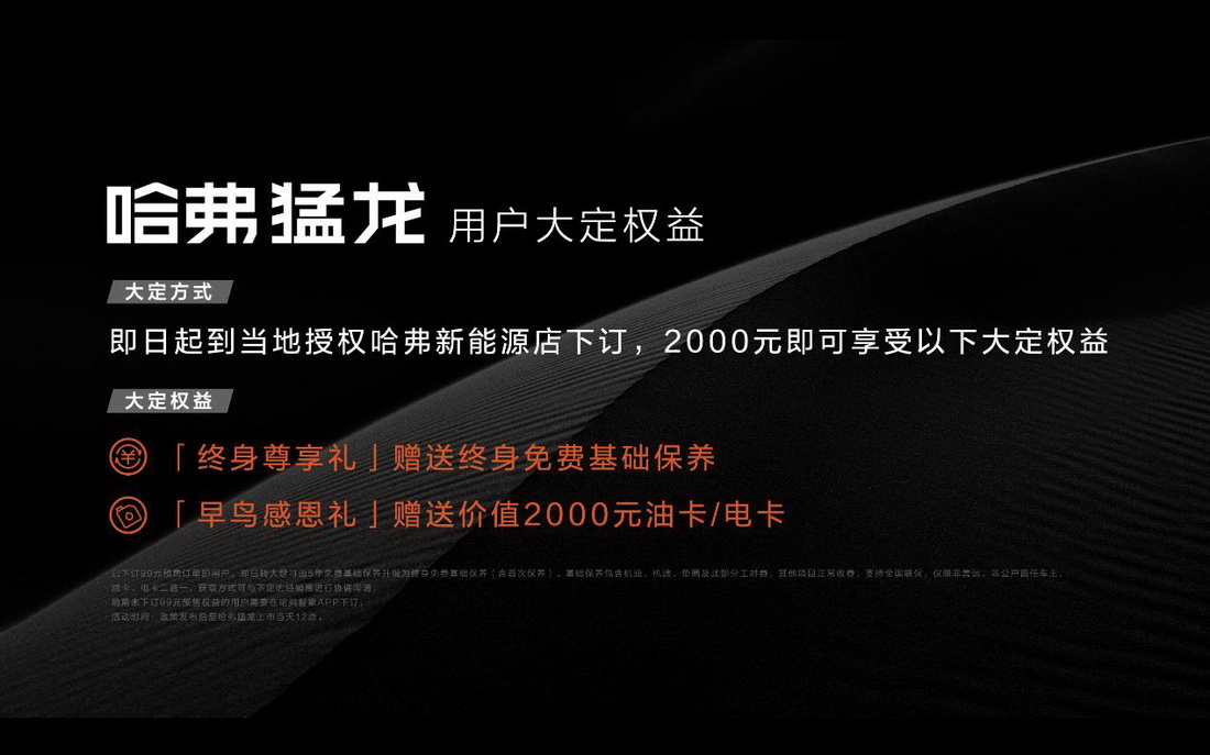 即日起到当地授权哈弗新能源店下定,2000元即可享受以下大定权益: