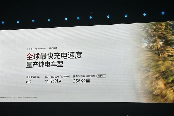 全新极氪001对动力系统做了全面升级,采用全栈自研的800V高压系统,并为用户提供了两款动力电池,分别是100度麒麟电池和95度宁德时代神行电池。其中,前者拥有750km的续航表现,并且电量从10%充到80%只需15分钟;后者拥有675km的续航表现,电量从10%充到80%只需11.5分钟,充电5分钟续航增加256km。